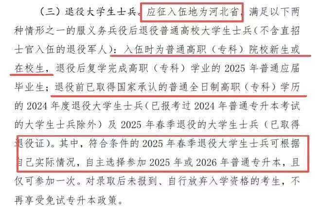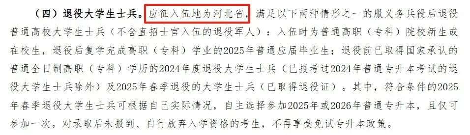 应征入伍地为河北省,退役后复学完成高职(专科)学业的应届毕业生或退役前已取得高职(专科)学历的毕业生,可参加河北省专升本免试招生。