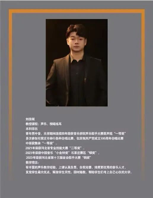 青年男高音 北京音协合唱团男高音演员,中国广播艺术团男高音演员,国家大剧院外聘男高音演员,北京大学合唱团男高音演员,中国合唱协会会员,参演国家大剧院原创歌剧《兰花花》,北京大学原创歌剧《叫我如何不想他》中国音乐学院原创歌剧《摇篮》有丰富的舞台演出经验,因材施教,注重个体差异,夯实基础,兼顾应试与艺术素养,注重终身艺术观念的培养核心教学目标短期:高效提升,帮助学生……。